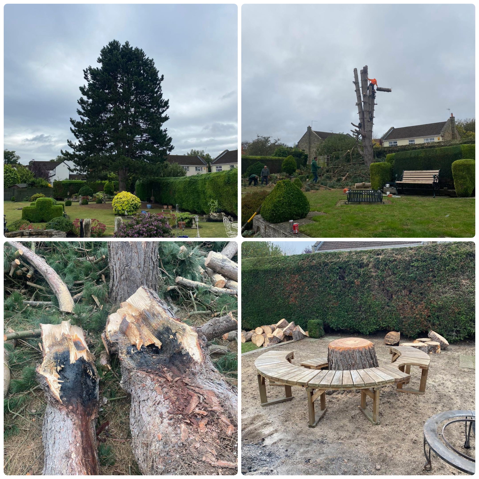 Rather than full stump removal, the remaining stump was retained and finished to allow it to be repurposed as a table, providing a sustainable and practical reuse of the timber.